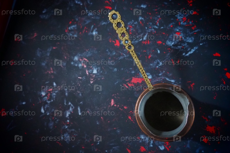 Балканская турка для турецкого кофе. Медная турка на черной поверхности. Старинная бронзовая посуда. Резная металлическая ручка с рисунком. Черный фон с белыми, красными и синими пятнами