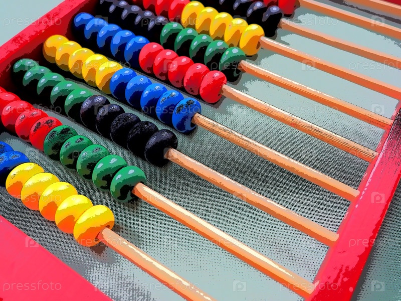 Концепция образования - счеты с множеством разноцветных бусин. Красные, синие, зеленые, черные, желтые детали на счетах. Математические упражнения. Школьная программа