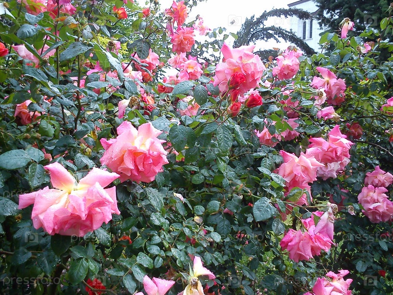 Красные и розовые розы с бутонами на фоне зеленого куста. Куст красных и розовых роз. Розы после дождя
