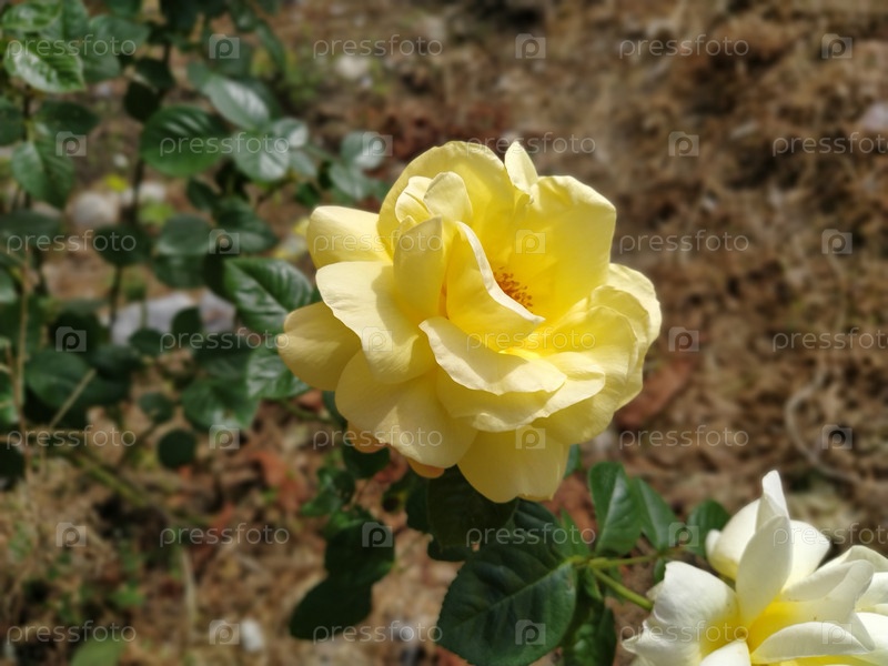 Красивая желтая роза в саду. Крупный план раскрытого бутона. Чайные розы. Садоводство и цветоводство. Нежные лепестки красиво завернуты