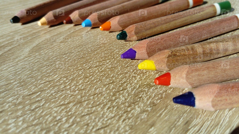 Карандаши лежат на деревянном столе. Разноцветные деревянные карандаши треугольной формы в разрезе предназначены для развития мелкой моторики руки ребенка