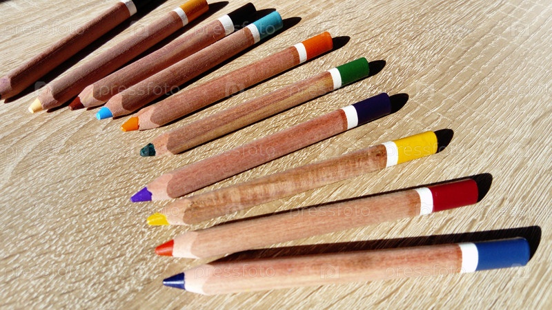На деревянном столе лежат несколько деревянных толстых цветных карандашей