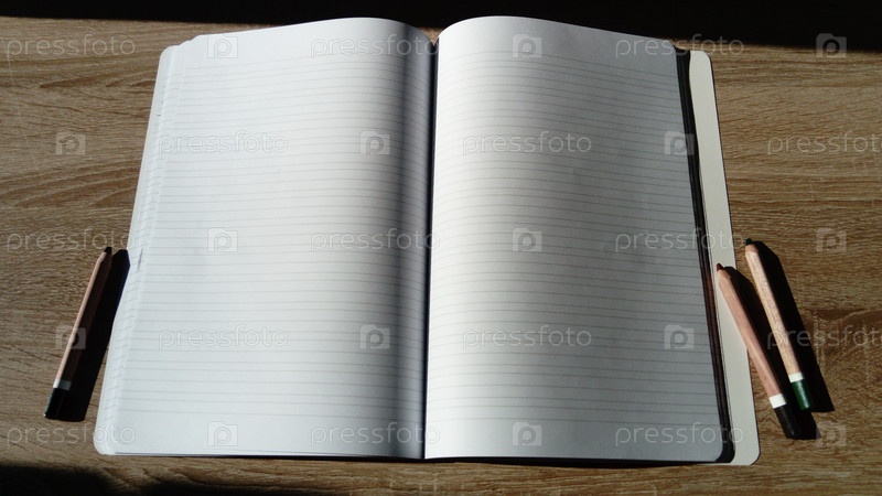 Блокнот разворота с пустыми белыми страницами. Слева и справа от блокнота на деревянном столе лежат цветные карандаши. Суровый естественный солнечный свет