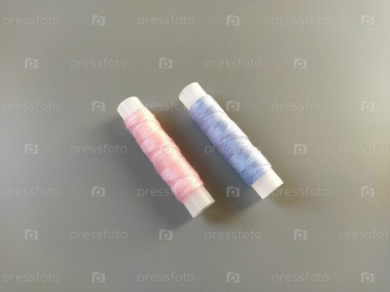 Катушки розовых и синих ниток на сером фоне. Текстильная промышленность