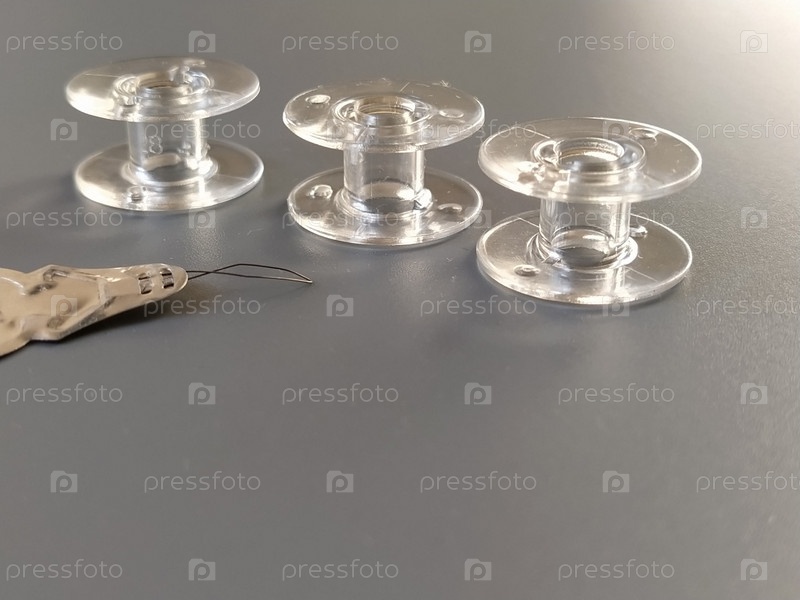 Петля для автоматической заправки нити в иглу швейной машины. Три прозрачные пластиковые шпульки для швейных машин. Текстильная промышленность. Деталь швейного оборудования. Серый фон, подсветка