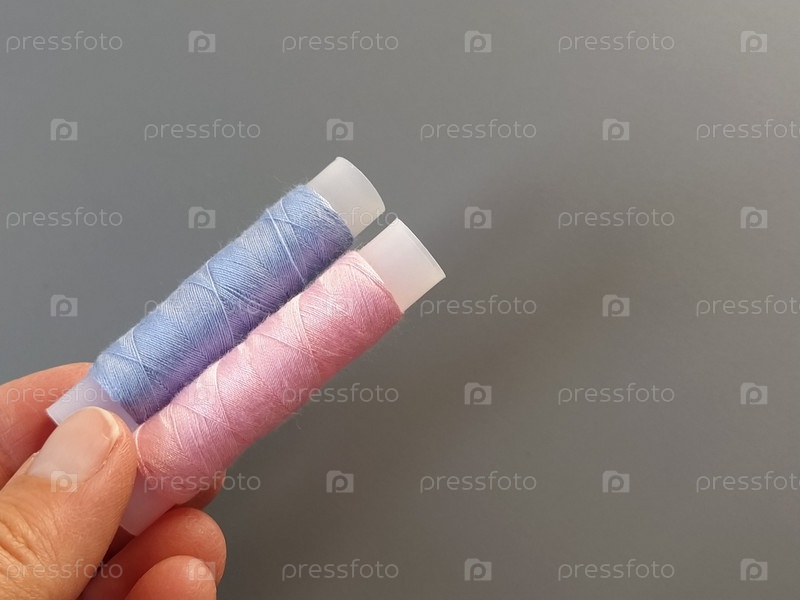 Катушки с розовыми и голубыми нитками на женской руке. Текстильная промышленность. Серый фон