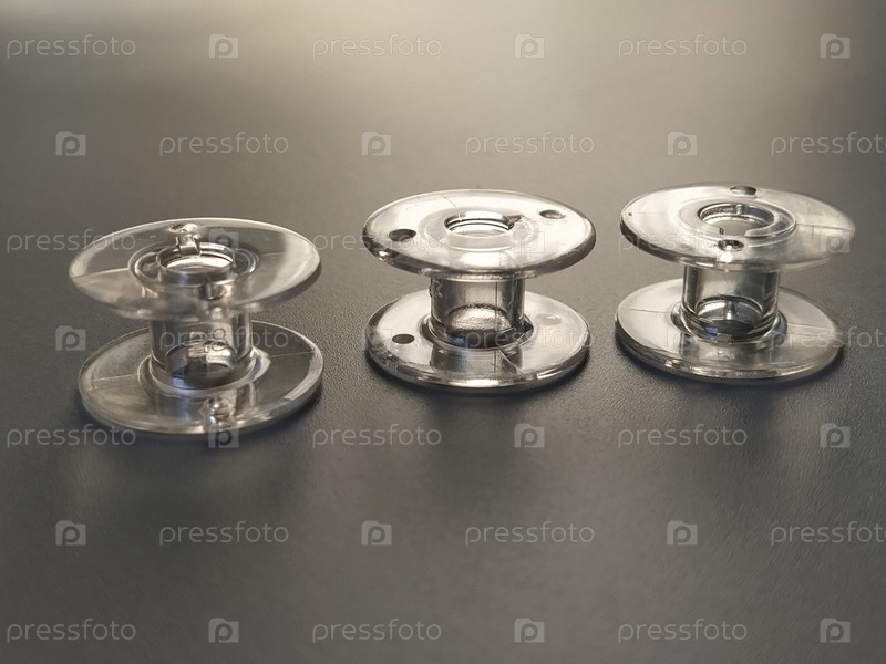 Три прозрачные пластиковые шпульки для швейных машин. Текстильная промышленность. Деталь швейного оборудования. Серый фон, подсветка
