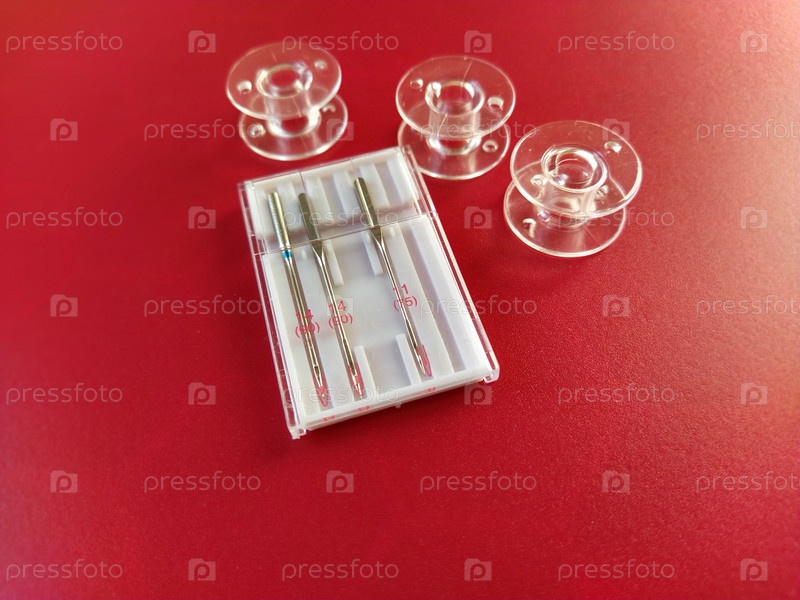 Пластиковые шпульки и набор игл для швейных машин на красном фоне