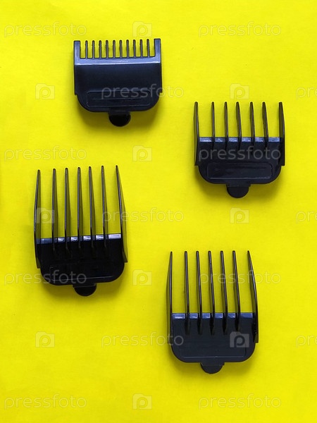 Насадки для машинки для стрижки волос. Четыре черных пластиковых гребня - ограничитель для измерения длины стриженых волос. Насадки от 1 см до 4 см. Парикмахерские инструменты на желтом фоне. Оборудование для парикмахерских