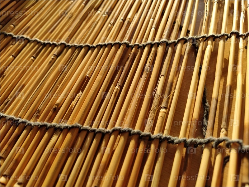 Соломенная подстилка, скатерть или небольшой коврик, разложенный на столе и сфотографированный сбоку. Мягкий вечерний солнечный свет отражается от стеблей. Некоторые палочки сломаны, нитки и веревки сплетены