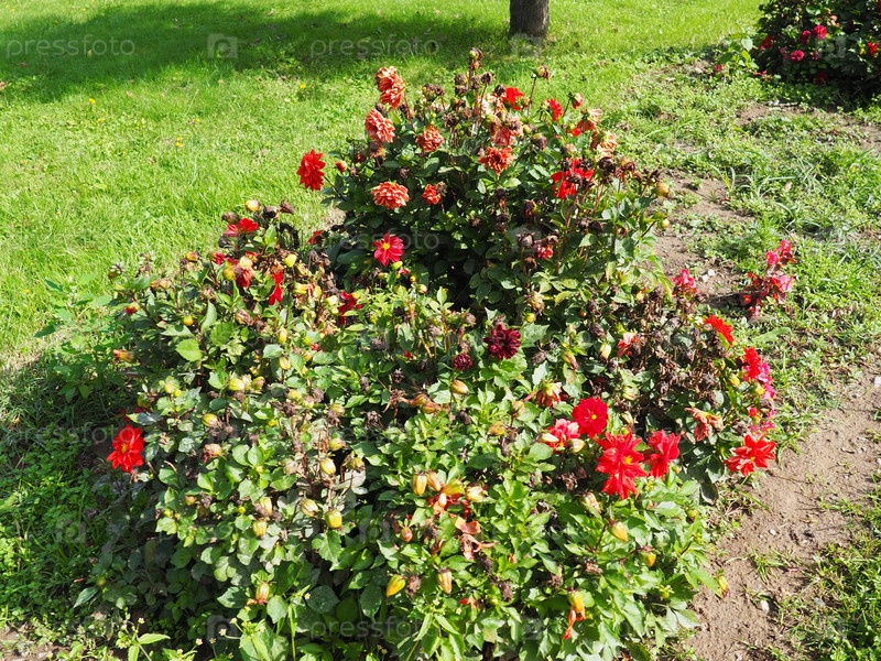 Красные георгины в саду. Георгины, род многолетних травянистых растений семейства сложноцветных с клубневидными корнями и крупными цветками яркой окраски. Цветоводство и садоводство