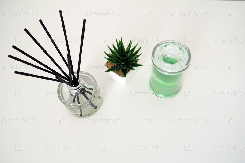 Ароматические палочки в стеклянном кубическом сосуде с эфирными маслами. Декор интерьера. Белый фон. Сансевьера или алоэ в горшке. Скопируйте пространство. Восковая свеча в стильной стеклянной колбе с крышкой