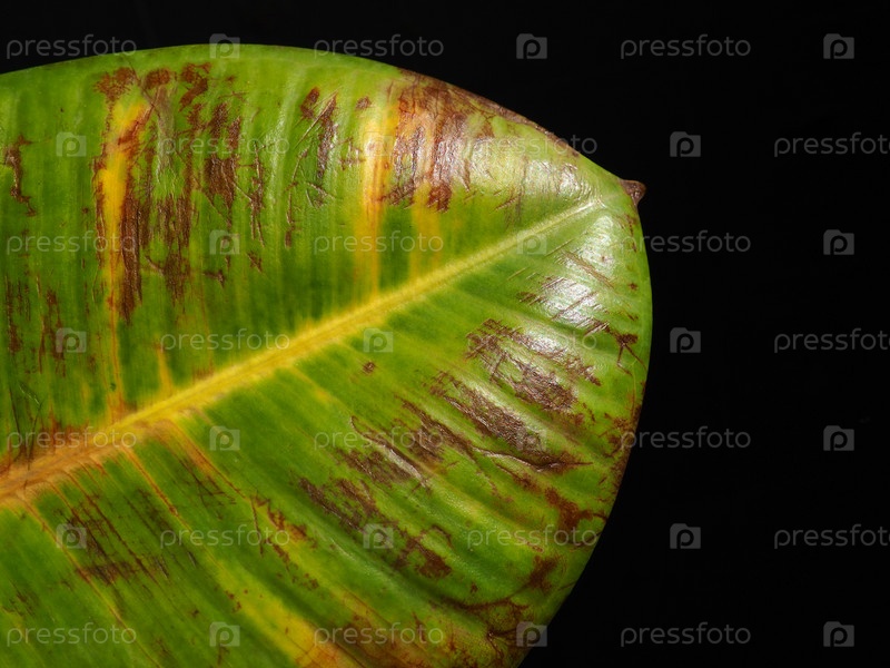 Фикус каучуконосный, или Фикус каучуконосный, вид растений из рода Фикус семейства тутовых семейства Морасовые. Большой, поврежденный лист фикуса крупным планом на черном фоне. Коричневые и желтые пятна и царапины