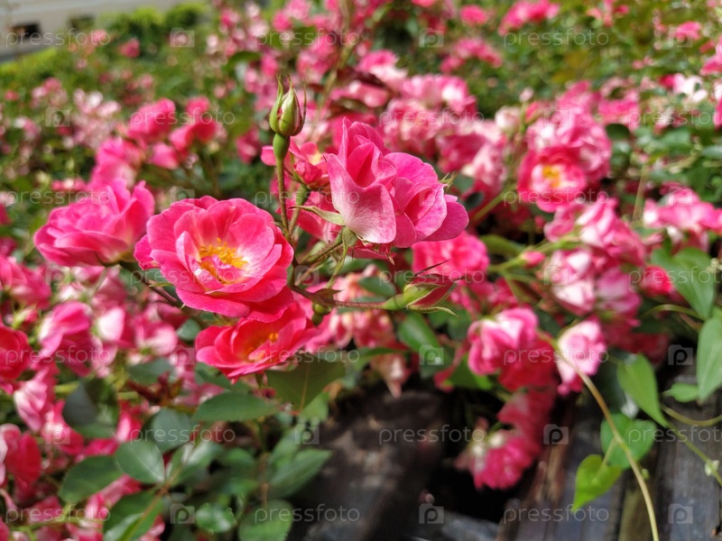 Цветущие розовые кустовые розы. Цветочный красивый фон