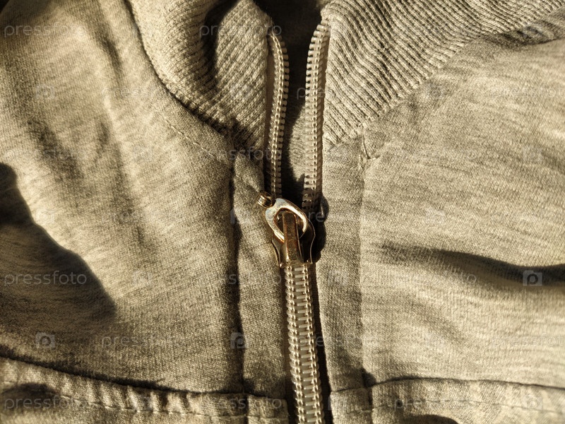 Металлический замок на серой ткани с длинным рукавом. Портняжное дело