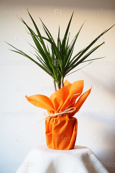 Драцена, тропическое растение как предмет интерьера. Подарок в оранжевой оберточной бумаге на столе с белой салфеткой. Белый фон. Драцена или Драценовые