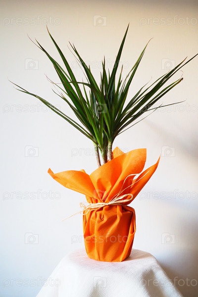 Драцена, тропическое растение как предмет интерьера. Подарок в оранжевой оберточной бумаге на столе с белой салфеткой. Белый фон. Драцена или Драценовые