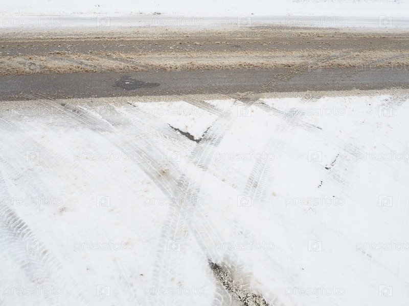 Сугробы на обочине дороги. Плохая погода и пробки. Снег на асфальте. Сложные условия вождения. Зимняя слякоть на дороге. Тормозной путь автомобиля