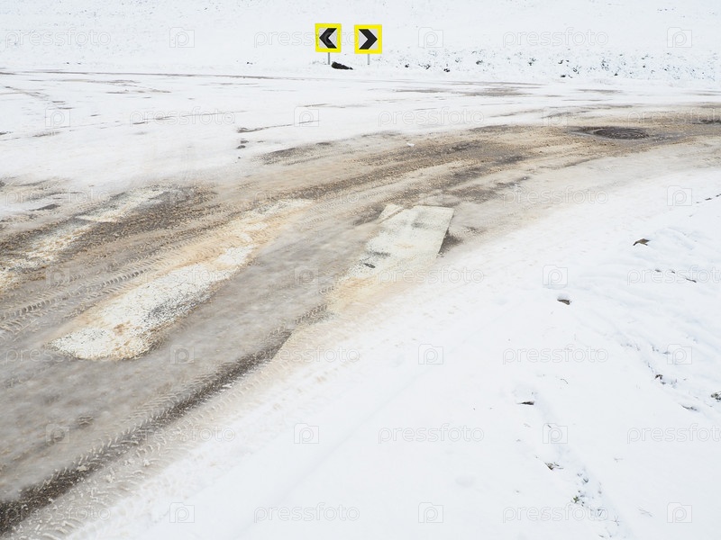 Вилка, вилка дорожных знаков. пешеходный переход. Сугробы на обочине дороги. Плохая погода и пробки. Снег на асфальте. Сложные условия вождения. Зимняя слякоть на дороге. Тормозной путь автомобиля