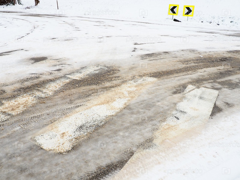 Вилка, вилка дорожных знаков. пешеходный переход. Сугробы на обочине дороги. Плохая погода и пробки. Снег на асфальте. Сложные условия вождения. Зимняя слякоть на дороге. Тормозной путь автомобиля