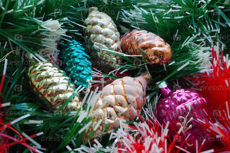 Новогодние и елочные игрушки, стеклянные шары в виде шишек и корзинок. Шишки и подвески из блестящей мишуры. Пустой макет открытки праздничного фона. Много новогодних украшений