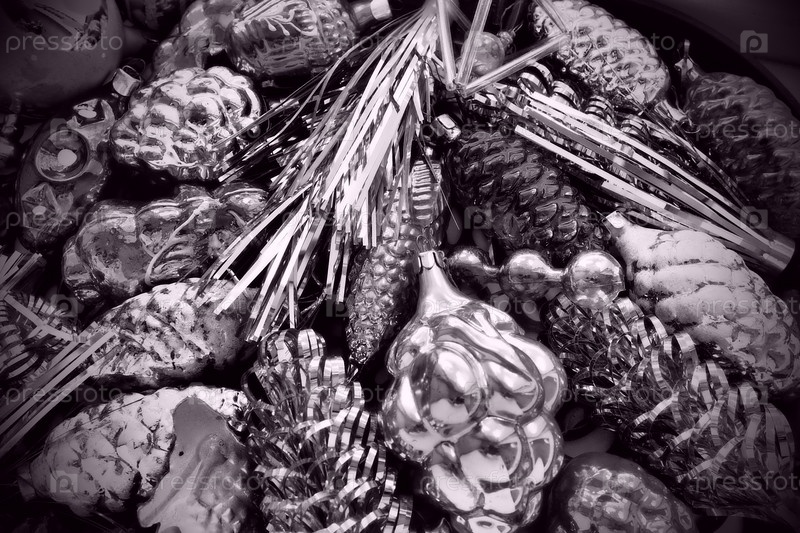 Новогодние и елочные игрушки, стеклянные шары в виде шишек и корзинок. Шишки и подвески блестящая мишура. Праздничный фон. Много новогодних украшений. Черно-белый монохромный