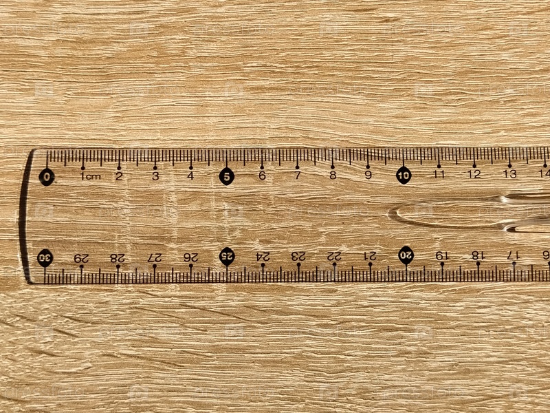 Прозрачная пластиковая школьная линейка на деревянном столе. Миллиметры и сантиметры отмечены черным цветом. Измерение длины и ширины линейкой
