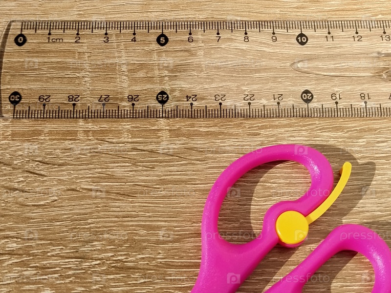 Прозрачная пластиковая школьная линейка на деревянном столе. Миллиметры и сантиметры отмечены черным цветом. Измерение длины и ширины линейкой. Ярко-розовые ножницы. Плоская укладка