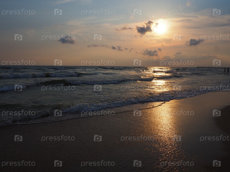 Закат над морем. Красивые волны на закате. Туристическая мекка, курорт. Вечернее небо. Лучи отражаются от воды