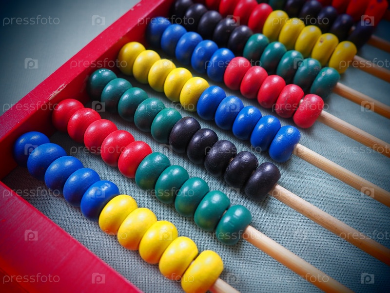 Концепция образования - счеты с множеством разноцветных бусин. Красные, синие, зеленые, черные, желтые детали на счетах. Математические упражнения. Школьная программа