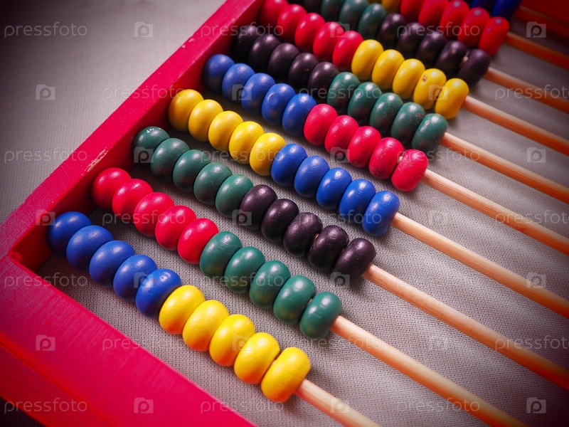 Концепция образования - счеты с множеством разноцветных бусин. Красные, синие, зеленые, черные, желтые детали на счетах. Математические упражнения. Школьная программа
