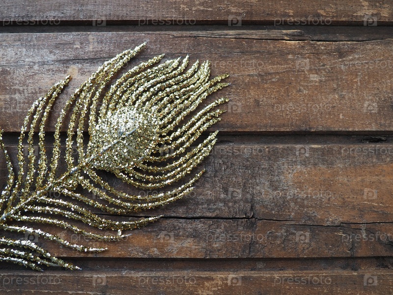 Золотое павлинье перо. Декоративная позолоченная ветка в виде павлиньего хвоста и петельки. Деревянный фон. Праздничное оформление и красивый карнавальный декор. Плоское пространство для копирования