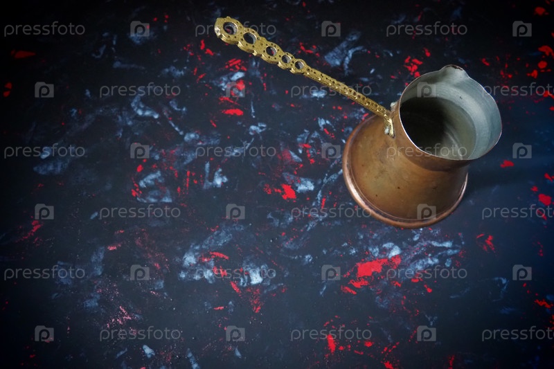 Балканская турка для турецкого кофе. Медная турка на черной поверхности. Старинная бронзовая посуда. Резная металлическая ручка с рисунком. Черный фон с белыми, красными и синими пятнами