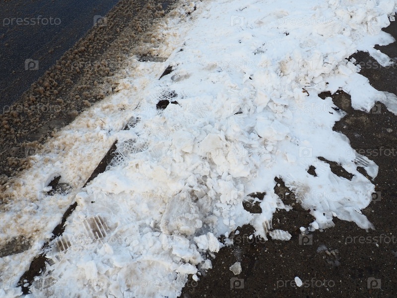 Обочина со сугробом. Сложные условия вождения. Мокрый скользкий тротуар со следами. Опасный лед. Грязная погода зимой. Следы автомобильных шин. Работа коммунальных служб по уборке