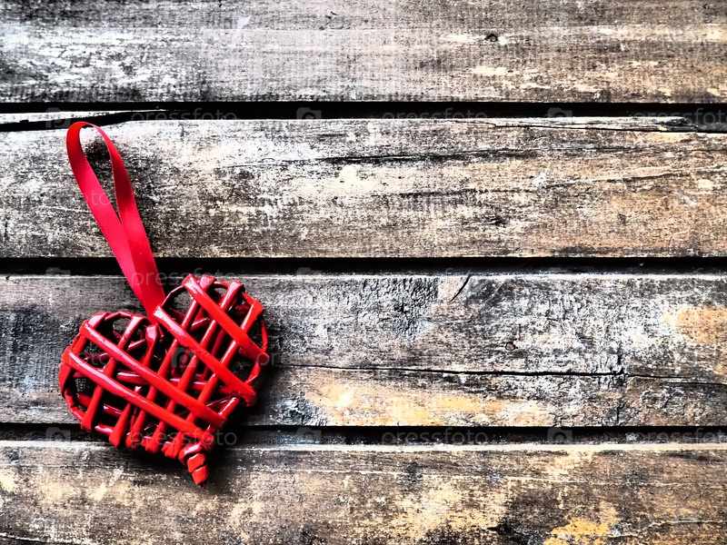 Любовь красное плетеное сердце на фоне деревянной текстуры. Открытка на день Святого Валентина. Вид сверху с копией пространства. Красное плетеное сердце из веток или соломы. Плоская укладка. Заявление о любви