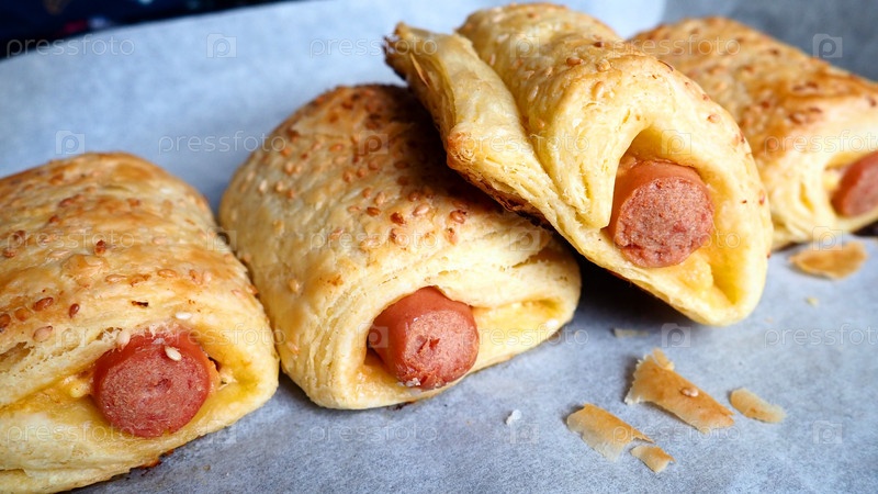 Сосиски в тесте на противне с пекарской бумагой. Вкусные свежие пироги из печи. Кулинарные изделия из дрожжевого теста с молочными колбасами. Посыпание кунжутом