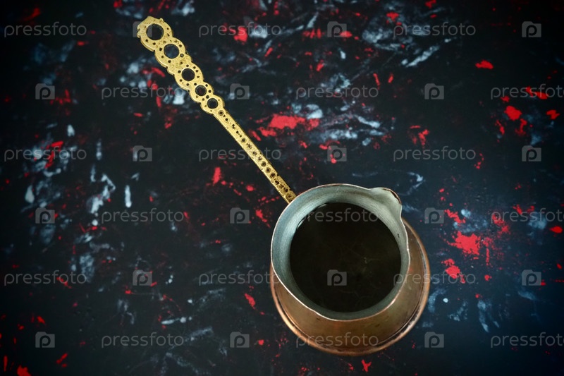 Балканская турка для турецкого кофе. Медная турка на черной поверхности. Старинная бронзовая посуда. Резная металлическая ручка с рисунком. Черный фон с белыми, красными и синими пятнами