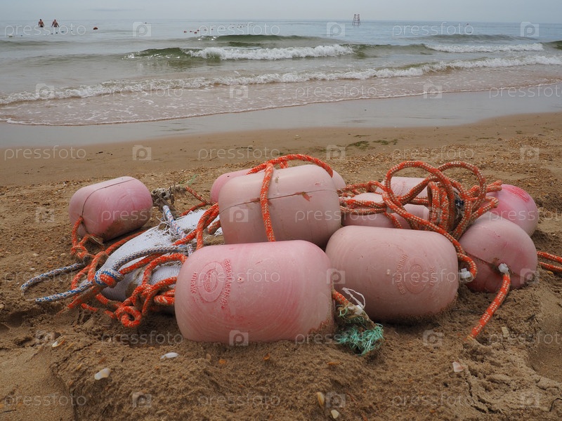 Буи в песке. Пляж с мокрым крупным кварцевым песком. На берегу остались спутанные веревки и пластиковые буйки. Спасательное оборудование. Конец летнего сезона. Штормовая погода на море или океане. Отлив