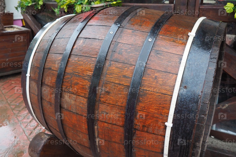Традиционная старая деревянная бочка с изогнутыми стенками и металлическими обручами. Посуда для созревания алкогольных напитков - медовухи, пива, вина, виски. Перекатываемый цилиндрический сосуд для жидких веществ
