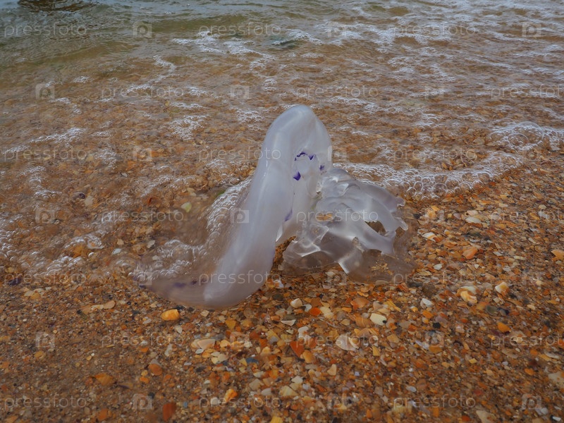 Прозрачная медуза выбрасывается волной на песчаный берег. Проблемы экологии. Обрезанная соединительная ткань мезоглеи. Медуза фаза жизненного цикла лианы из подвида Medusozoa