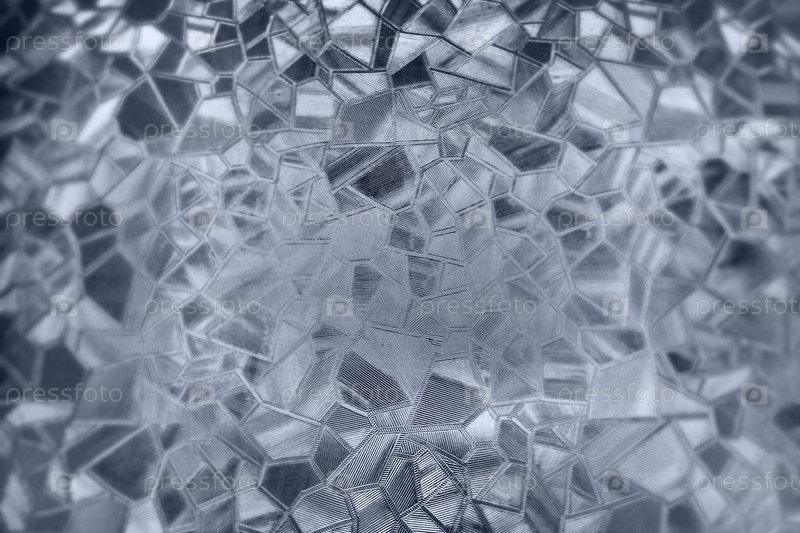 Рельефный стеклянный фон. Монохромное рифленое стекло. Преломление света на неровной прозрачной поверхности при контровом свете. Игра белых и серых бликов. Черные области. Абстрактный фон