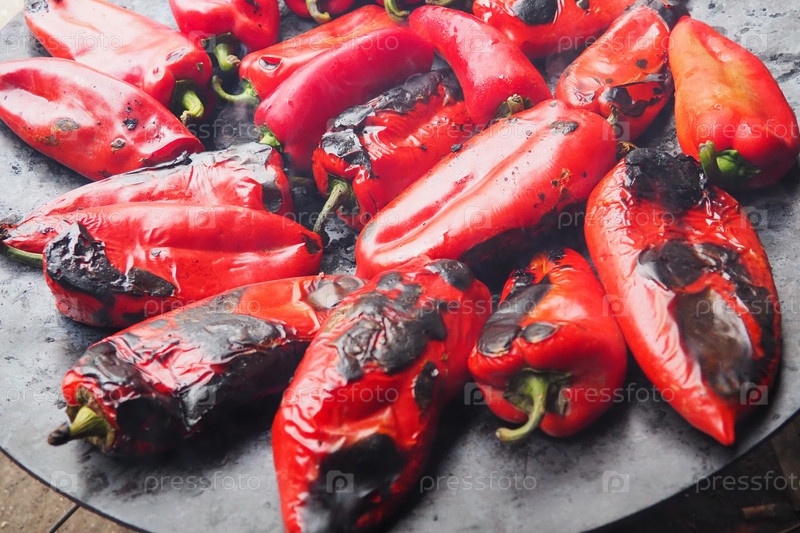 Жареный вкусный красный перец для аромата дыма и быстрой очистки. Балканские рецепты салатов. Термическая обработка урожая перца на металлическом круге. Перец выложен на плоском противне крупным планом