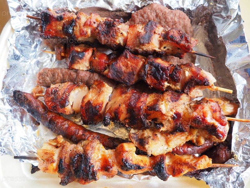 Мясо на гриле в одноразовой упаковке и алюминиевой фольге, доставлено из ресторана. Доставка еды на дом из ресторанов и кафе. Шашлык и кусковое мясо курицы, свинины и баранины