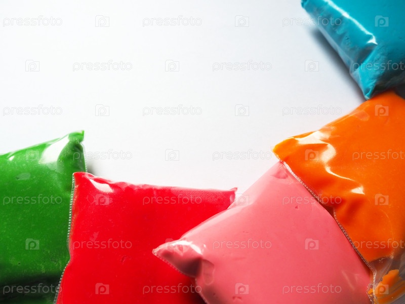 Красочный детский пластилин на белом фоне, красочная глина для лепки теста. Фасовка цветного мягкого пластилина в полиэтиленовые пакеты. Скопируйте пространство