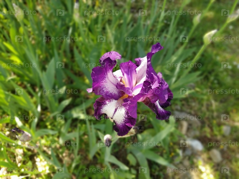 Красивая фиолетовая радужка с белой серединой. Изогнутые изящные яркие лепестки цветка. Зеленый размытый фон. Селекционный сорт ириса. Большой распустившийся бутон. тонкие длинные листья