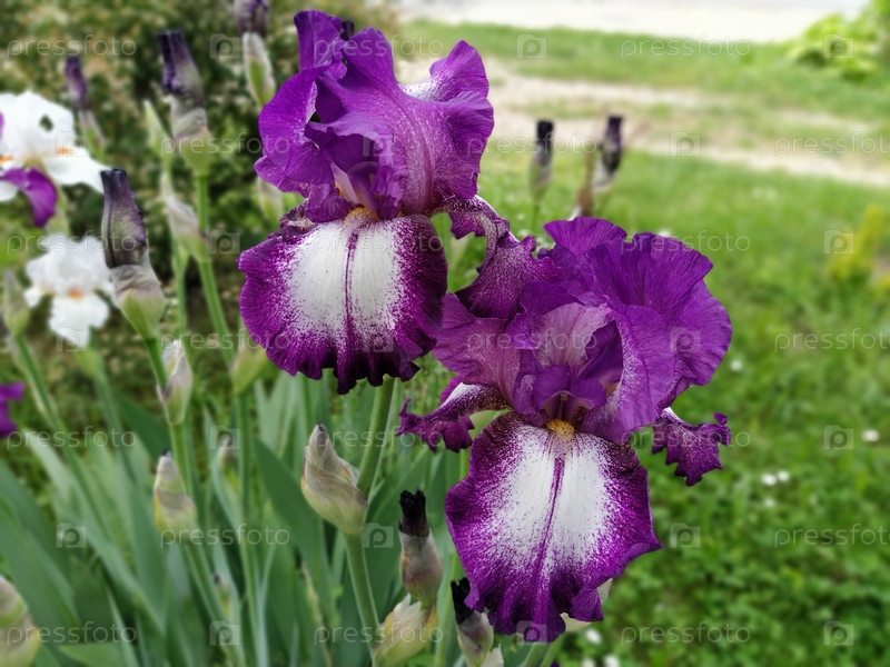Два красивых белых и фиолетовых ириса крупным планом. Изящный цветок в саду