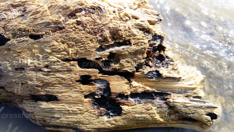 Мокрая крошащаяся древесина крупным планом. Деревянная поверхность, которая долгое время находится в воде. Вуди Баланс плыл вниз по течению
