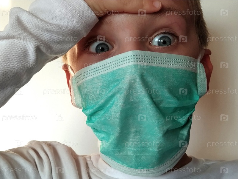 Ребенок в маске. Лицо 7-летнего мальчика в защитной хирургической маске крупным планом. Школьник со светлыми волосами и серо-голубыми глазами на белом фоне. Эмоция страха или удивления. Поднятая правая рука