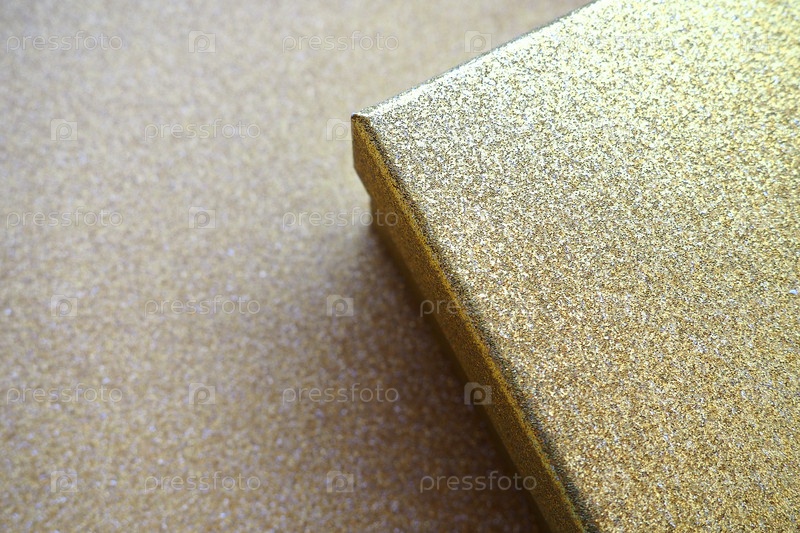 Золотая подарочная коробка на золотом фоне. Декоративная коробка-сюрприз. Копировать пространство