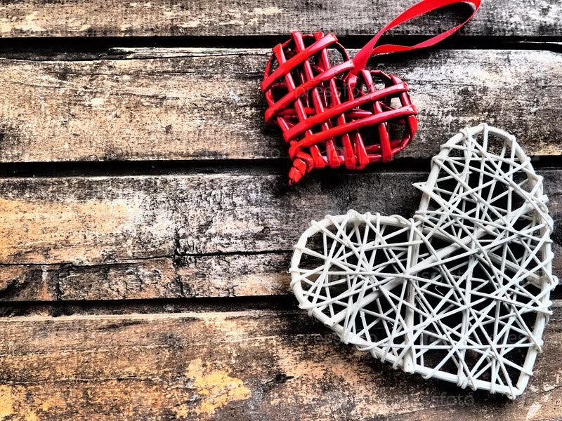 Плетеные сердца на деревянном фоне. Два красных плетеных сердца с подвесной петлей. Белое большое сердце. Два любовника. Тема дня святого Валентина. Горизонтальные доски. копирайт. Плоская укладка